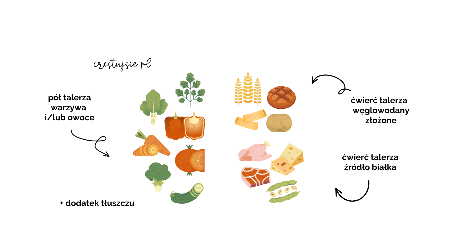 Komponując swoje posiłki, możesz bazować na tzw. zasadzie zdrowego talerza, która określa proporcje składników na talerzu. Takie łączenie produktów sprawia, że ładunek glikemiczny całego posiłku jest niższy, a sytość utrzymuje się długo.
