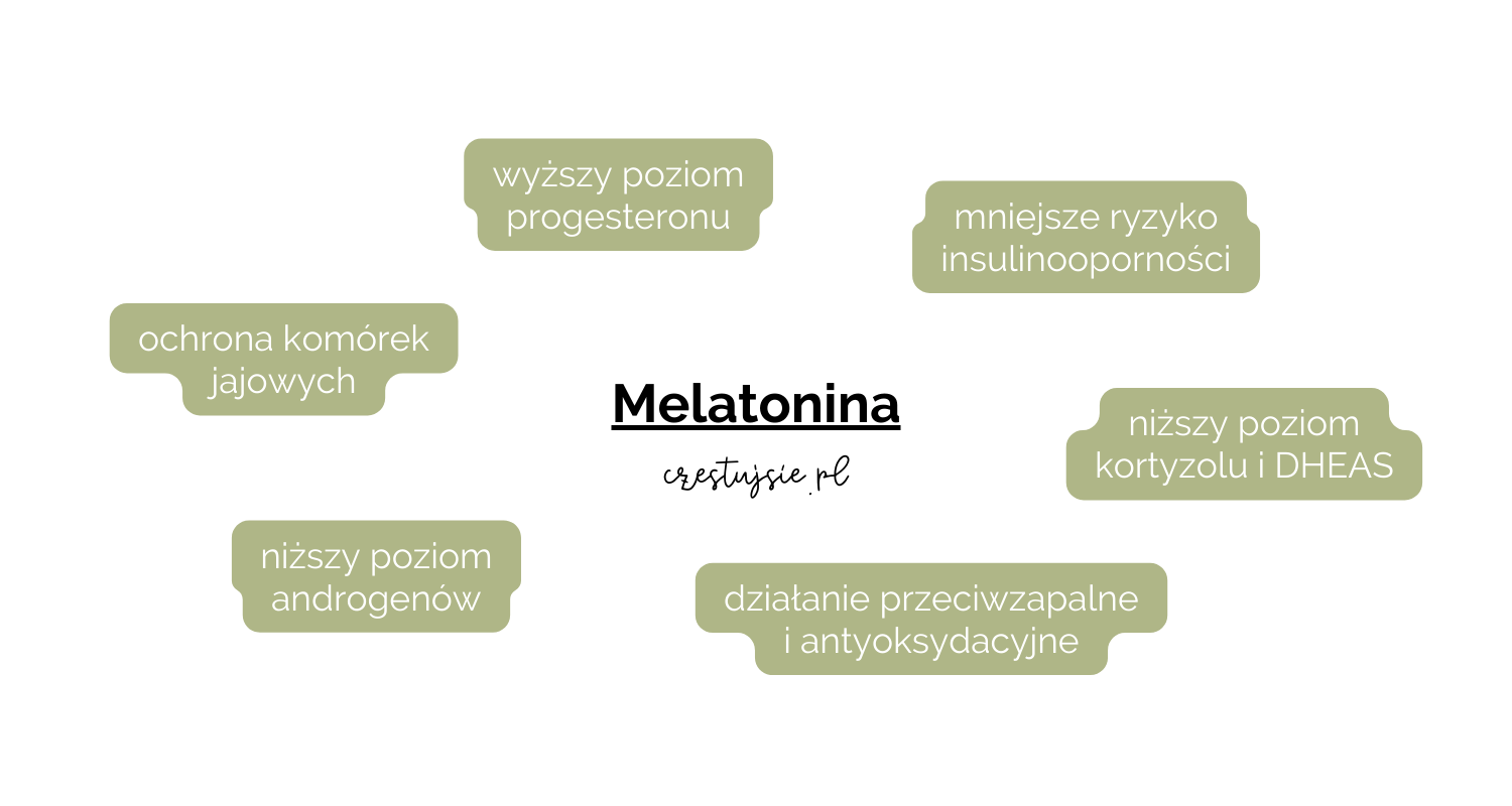 Melatonina, hormon snu, wykazuje działanie antyoksydacyjne i przeciwzapalne – chroni komórki jajowe przed uszkodzeniami, wpływa na regulację cyklu miesiączkowego poprzez stymulowanie produkcji progesteronu, pomaga w obniżeniu poziomu androgenów. Dodatkowo zaburzenie rytmu dobowego i produkcji melatoniny jest związane z wyższym ryzykiem insulinooporności, stanu przedcukrzycowego i zaburzeń metabolicznych. Melatonina działa antagonistycznie do kortyzolu, dlatego jest szczególnie ważna przy jego podwyższonym poziomie.