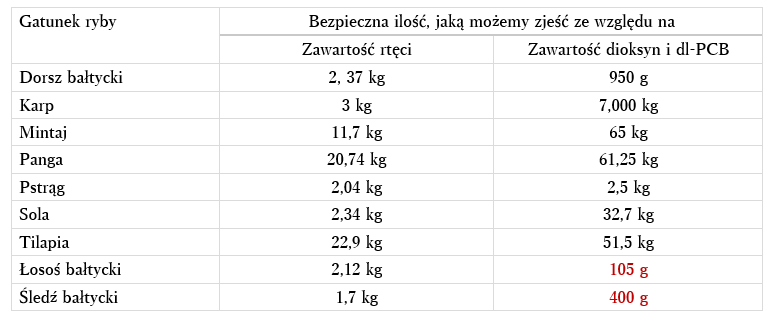 Ilości ryb, które możemy spożywać nie przekraczając PTWI są bardzo różne w zależności od gatunku. Dla przykładu, możemy zjeść tygodniowo 2,5 kg świeżego pstrąga, ale już tylko 75 g wędzonego łososia lub 240 g szprotek w pomidorach. Więcej dioksyn znajduje się w rybach wędzonych niż w świeżych, dlatego porcja którą możemy bezpiecznie zjeść jest mniejsza. Wskaźnik PTWI ogółem dla dioksyn według MIR wynosi w Polsce trochę ponad 11%, czyli jak łatwo policzyć, do 100% pozostaje trochę mniej bezpiecznego „zapasu” niż w przypadku rtęci, ale nadal sporo.