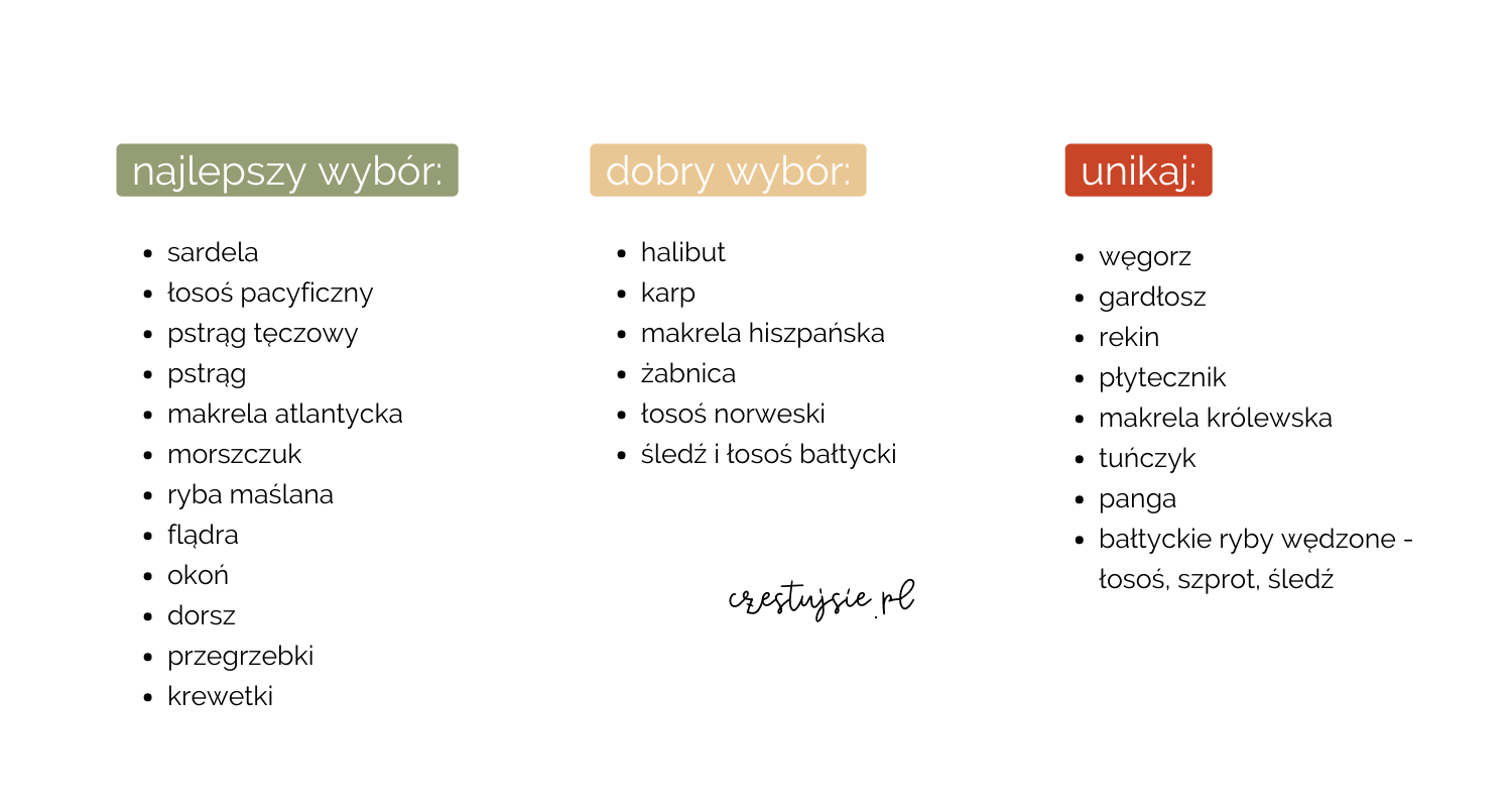 - Staraj się kupować ryby o stosunkowo niskiej zawartości zanieczyszczeń, jednocześnie bogate w kwasy tłuszczowe omega 3.